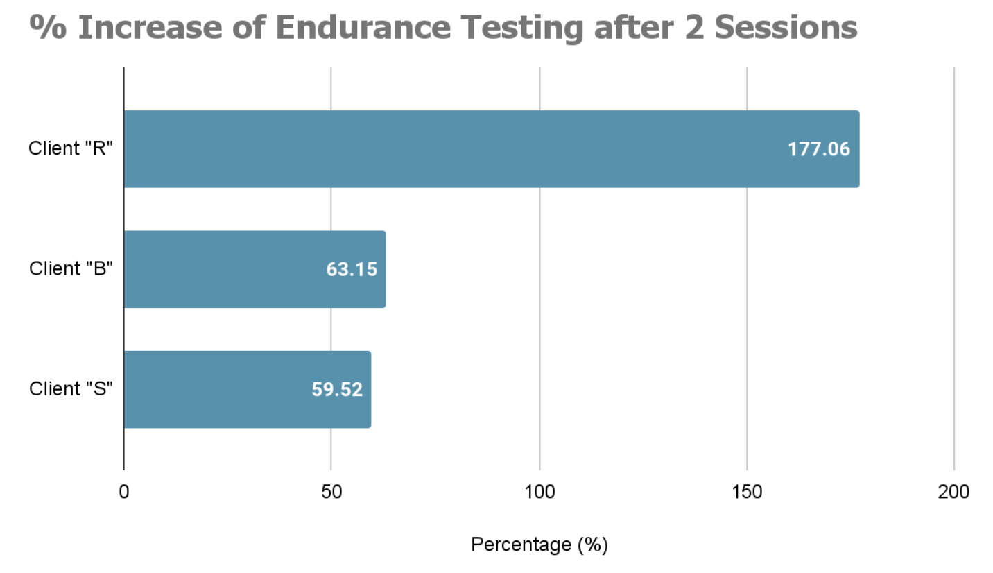 After 12 days, 2 sessions, all three clients saw improvement in their levels of endurance from 59% to 177% over their starting measurments and 25% to 120% in strength increase.